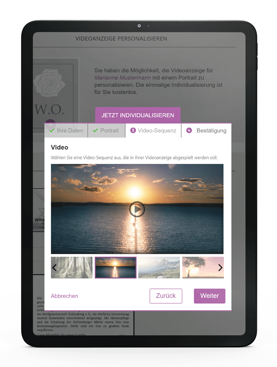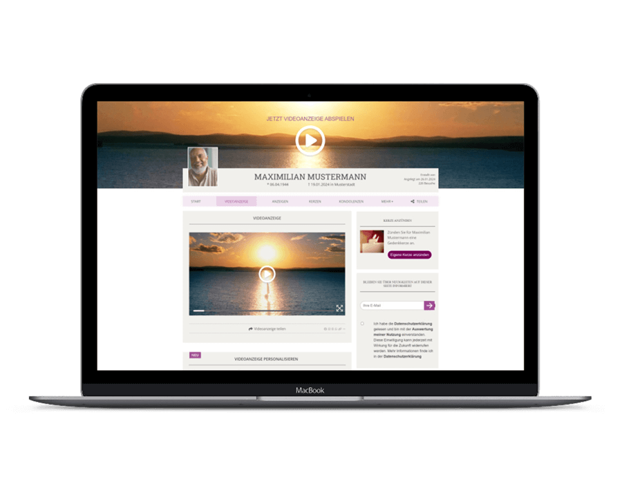 Inserenten haben die Möglichkeit, die Videoanzeige auf der Gedenkseite einmalig kostenlos anzupassen. Klicken Sie dafür auf der Unterseite „VIDEOANZEIGE“ auf den Button „VIDEOANZEIGE ANPASSEN“. Nun können Sie Ihre Daten eingeben, Ihr Lieblingsportrait des Verstorbenen hochladen und eine von acht Videovorlagen (Sterne, Berge, Strand, Boot, Wanderung, Küste, Stille, Sonnenaufgang) wählen, welche zu Ihrem geliebten Menschen passt.
