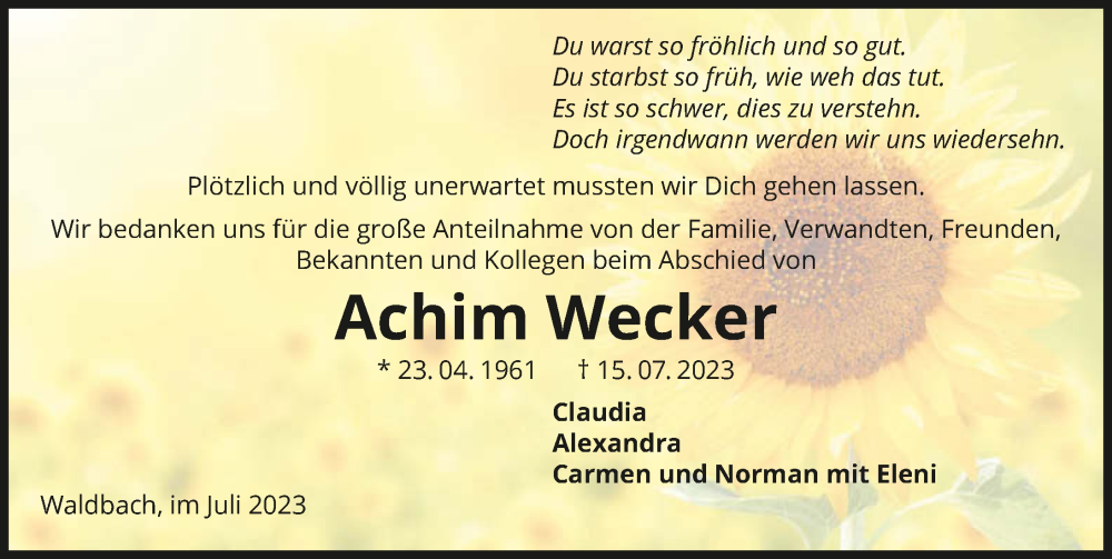 Hier finden Sie alle Traueranzeigen aus der Zeitung, die bisher für Achim Wecker erschienen sind. Weitere Traueranzeigen, die in der Zeitung erscheinen, werden hier ebenfalls aufgelistet