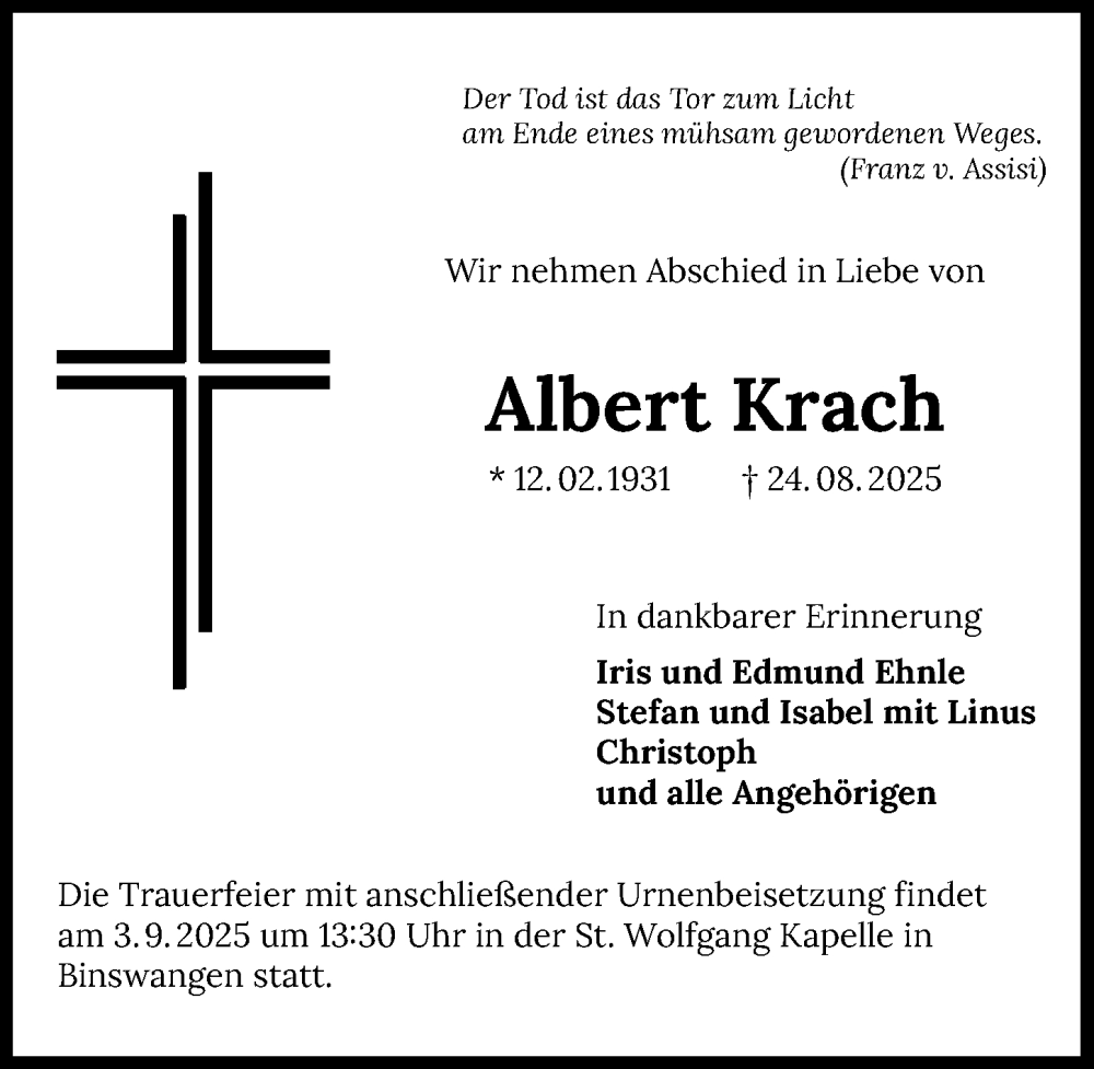Hier finden Sie alle Traueranzeigen aus der Zeitung, die bisher für Albert Krach erschienen sind. Weitere Traueranzeigen, die in der Zeitung erscheinen, werden hier ebenfalls aufgelistet