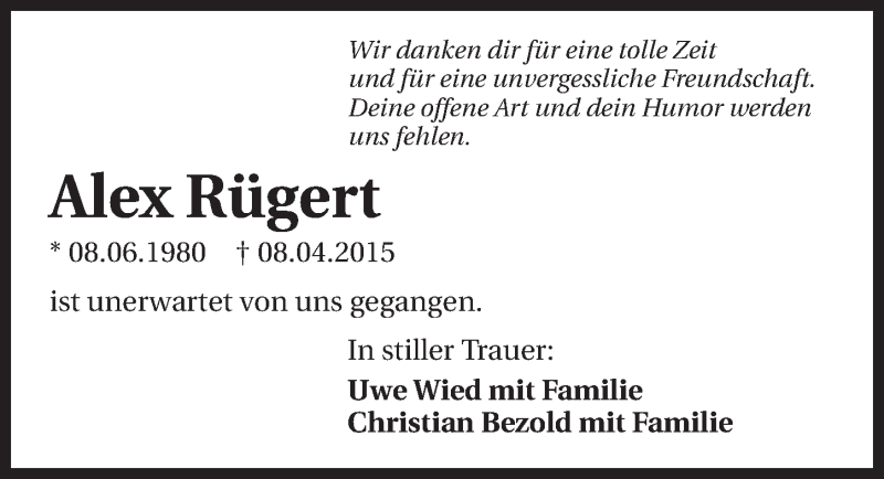 Hier finden Sie alle Traueranzeigen aus der Zeitung, die bisher für Alex Rügert erschienen sind. Weitere Traueranzeigen, die in der Zeitung erscheinen, werden hier ebenfalls aufgelistet