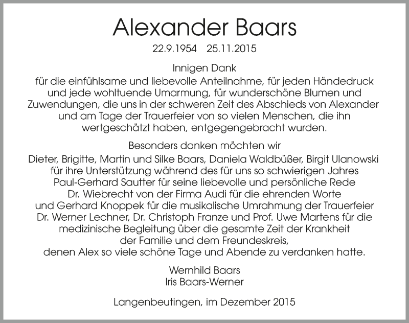 Hier finden Sie alle Traueranzeigen aus der Zeitung, die bisher für Alexander Baars erschienen sind. Weitere Traueranzeigen, die in der Zeitung erscheinen, werden hier ebenfalls aufgelistet
