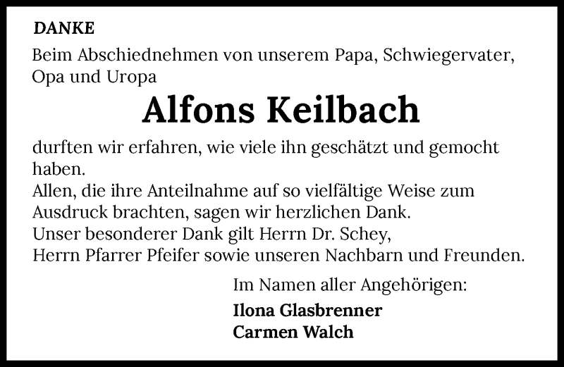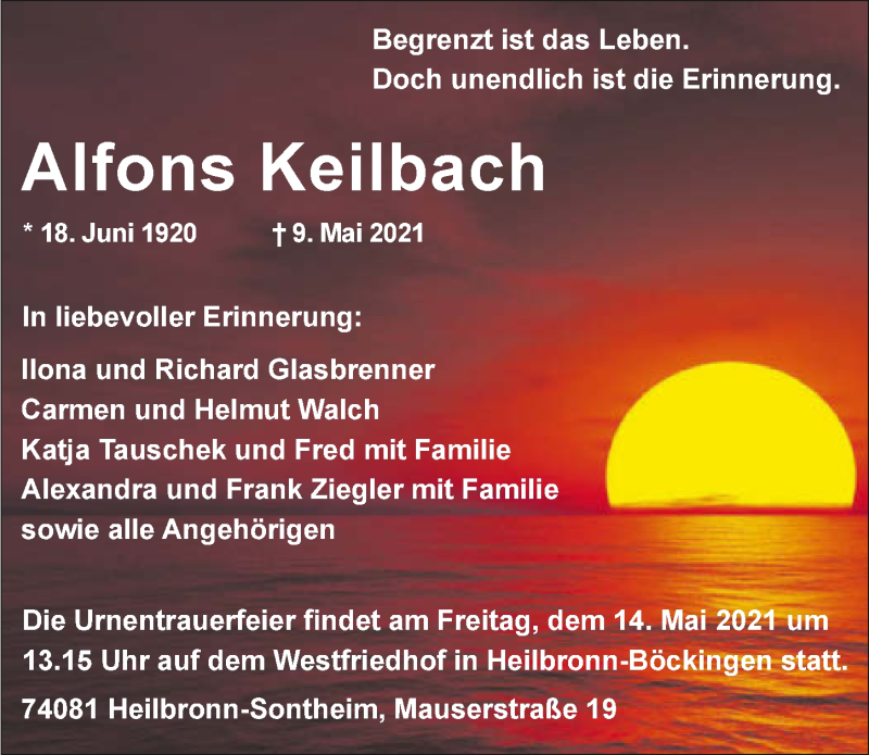 Hier finden Sie alle Traueranzeigen aus der Zeitung, die bisher für Alfons Keilbach erschienen sind. Weitere Traueranzeigen, die in der Zeitung erscheinen, werden hier ebenfalls aufgelistet