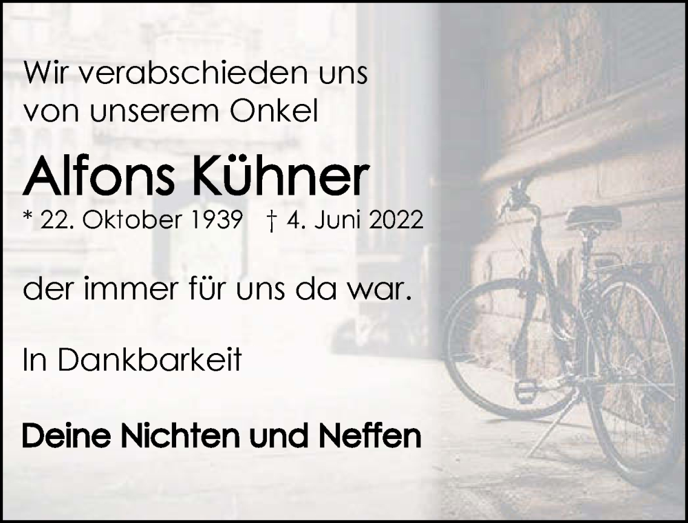 Hier finden Sie alle Traueranzeigen aus der Zeitung, die bisher für Alfons Kühner erschienen sind. Weitere Traueranzeigen, die in der Zeitung erscheinen, werden hier ebenfalls aufgelistet