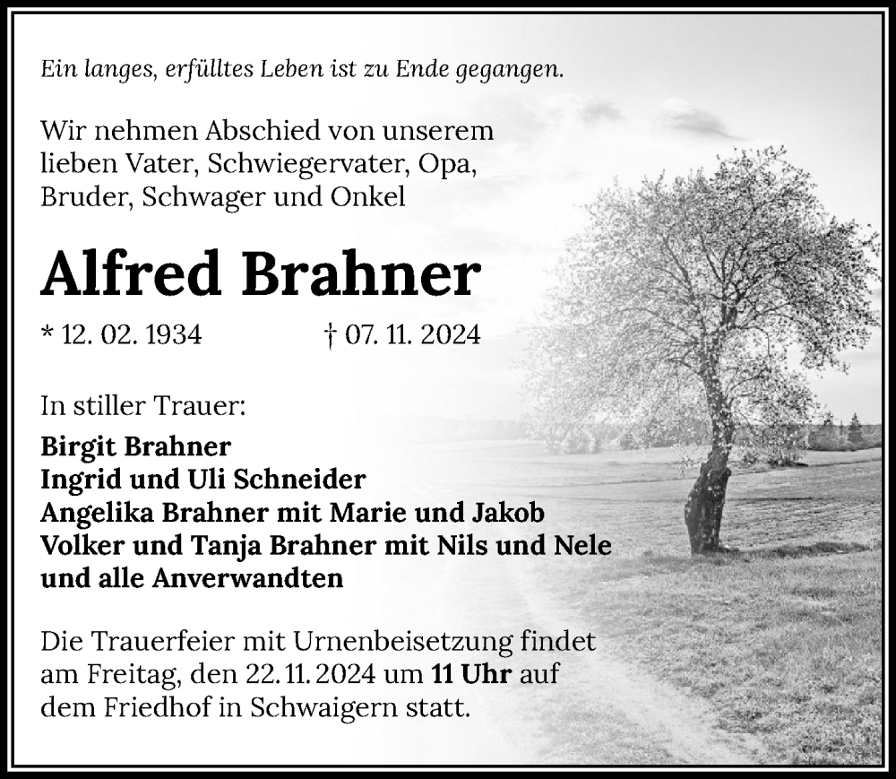 Hier finden Sie alle Traueranzeigen aus der Zeitung, die bisher für Alfred Brahner erschienen sind. Weitere Traueranzeigen, die in der Zeitung erscheinen, werden hier ebenfalls aufgelistet