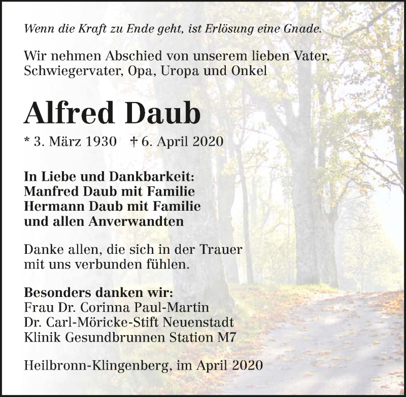 Hier finden Sie alle Traueranzeigen aus der Zeitung, die bisher für Alfred Daub erschienen sind. Weitere Traueranzeigen, die in der Zeitung erscheinen, werden hier ebenfalls aufgelistet