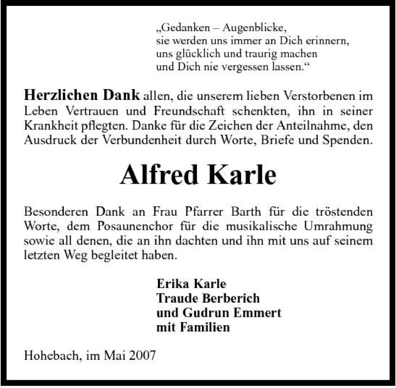 Hier finden Sie alle Traueranzeigen aus der Zeitung, die bisher für Alfred Karle erschienen sind. Weitere Traueranzeigen, die in der Zeitung erscheinen, werden hier ebenfalls aufgelistet