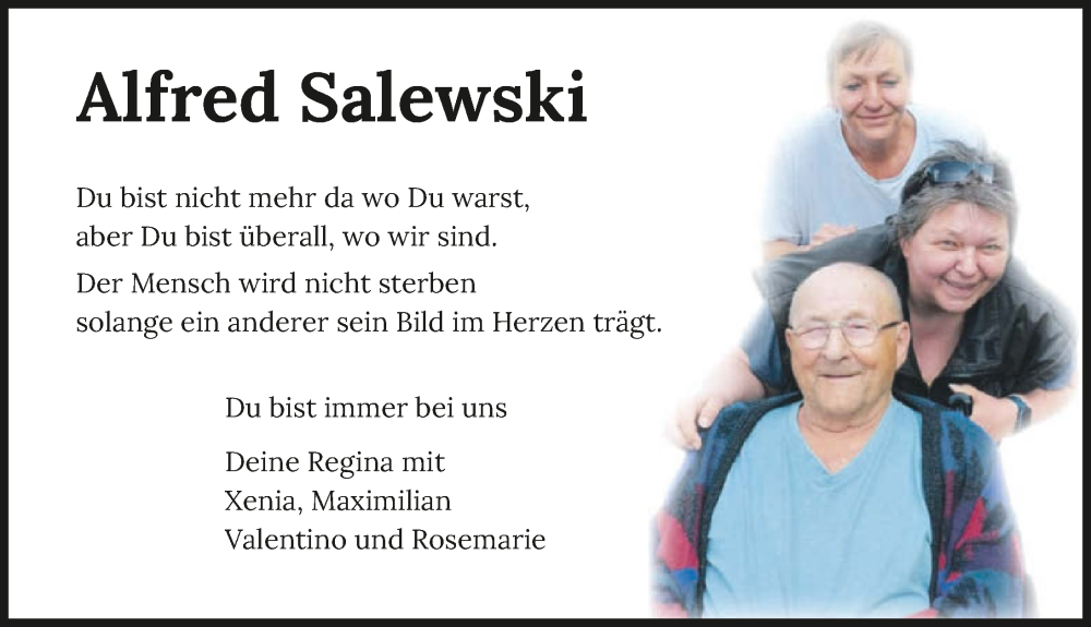 Hier finden Sie alle Traueranzeigen aus der Zeitung, die bisher für Alfred Salewski erschienen sind. Weitere Traueranzeigen, die in der Zeitung erscheinen, werden hier ebenfalls aufgelistet