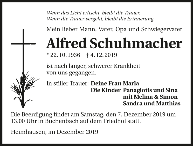 Hier finden Sie alle Traueranzeigen aus der Zeitung, die bisher für Alfred Schuhmacher erschienen sind. Weitere Traueranzeigen, die in der Zeitung erscheinen, werden hier ebenfalls aufgelistet