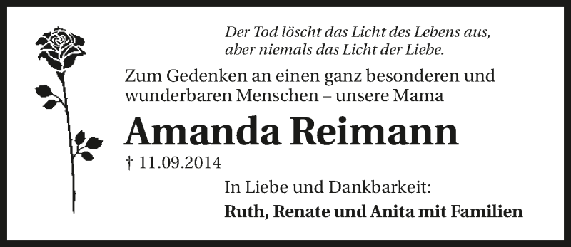 Hier finden Sie alle Traueranzeigen aus der Zeitung, die bisher für Amanda Reimann erschienen sind. Weitere Traueranzeigen, die in der Zeitung erscheinen, werden hier ebenfalls aufgelistet