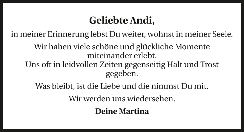 Hier finden Sie alle Traueranzeigen aus der Zeitung, die bisher für Andrea Tedesco-Krämer erschienen sind. Weitere Traueranzeigen, die in der Zeitung erscheinen, werden hier ebenfalls aufgelistet