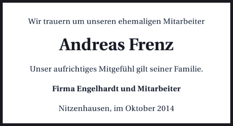 Hier finden Sie alle Traueranzeigen aus der Zeitung, die bisher für Andreas Frenz erschienen sind. Weitere Traueranzeigen, die in der Zeitung erscheinen, werden hier ebenfalls aufgelistet
