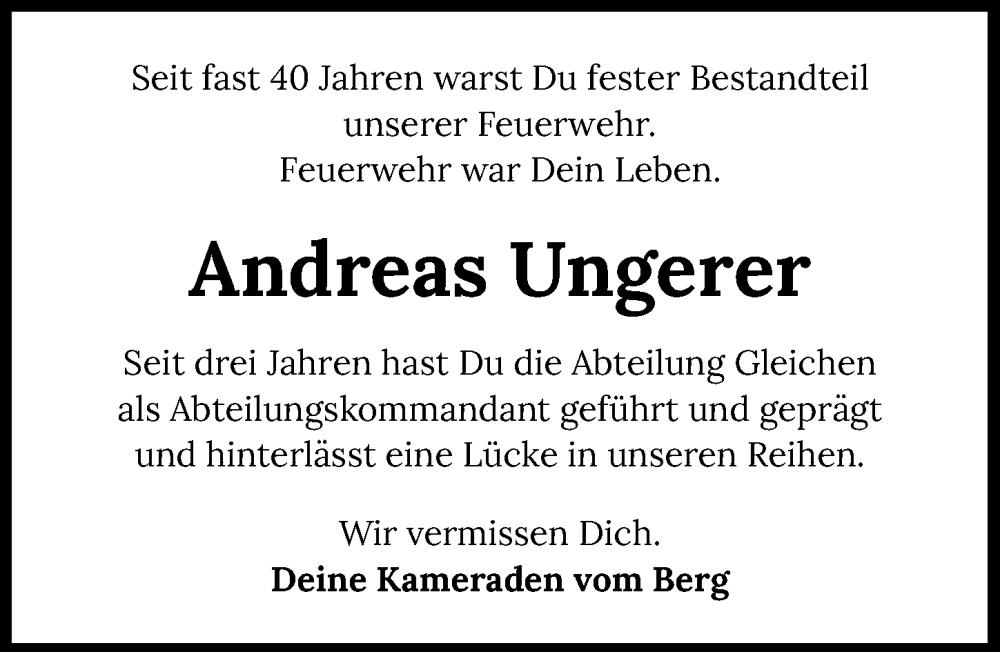 Hier finden Sie alle Traueranzeigen aus der Zeitung, die bisher für Andreas Unger erschienen sind. Weitere Traueranzeigen, die in der Zeitung erscheinen, werden hier ebenfalls aufgelistet