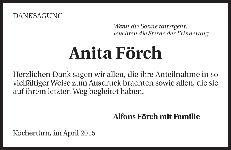 Hier finden Sie alle Traueranzeigen aus der Zeitung, die bisher für Anita Förch erschienen sind. Weitere Traueranzeigen, die in der Zeitung erscheinen, werden hier ebenfalls aufgelistet