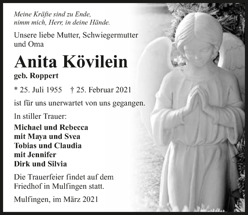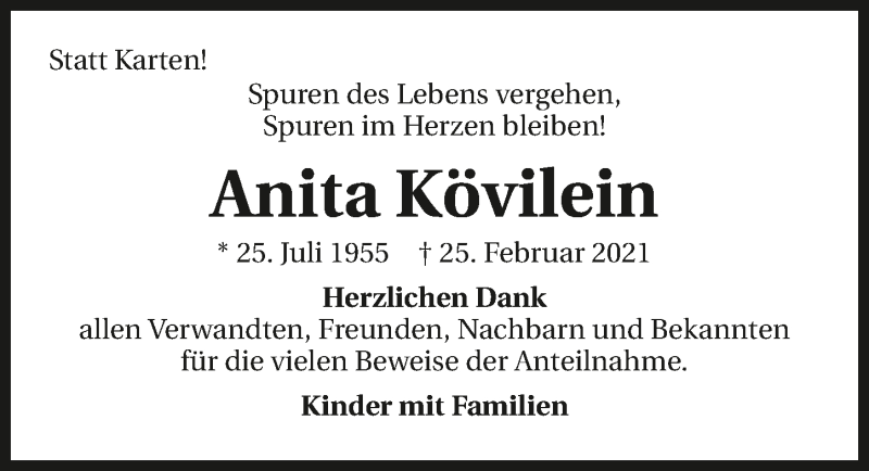 Hier finden Sie alle Traueranzeigen aus der Zeitung, die bisher für Anita Kövilein erschienen sind. Weitere Traueranzeigen, die in der Zeitung erscheinen, werden hier ebenfalls aufgelistet