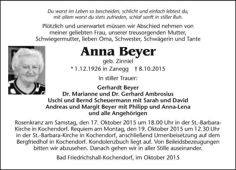 Hier finden Sie alle Traueranzeigen aus der Zeitung, die bisher für Anna Beyer erschienen sind. Weitere Traueranzeigen, die in der Zeitung erscheinen, werden hier ebenfalls aufgelistet