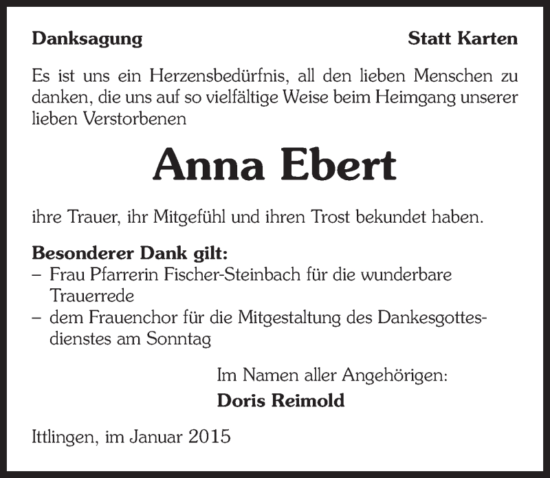 Hier finden Sie alle Traueranzeigen aus der Zeitung, die bisher für Anna Ebert erschienen sind. Weitere Traueranzeigen, die in der Zeitung erscheinen, werden hier ebenfalls aufgelistet