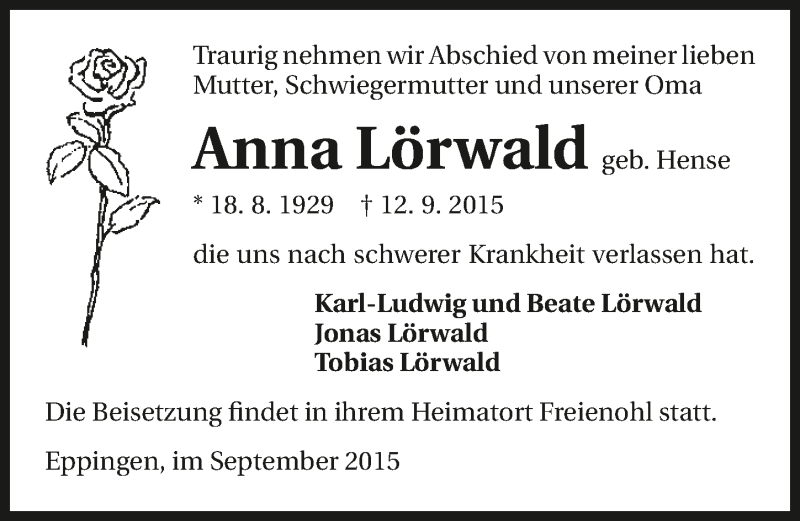 Hier finden Sie alle Traueranzeigen aus der Zeitung, die bisher für Anna Lörwald erschienen sind. Weitere Traueranzeigen, die in der Zeitung erscheinen, werden hier ebenfalls aufgelistet