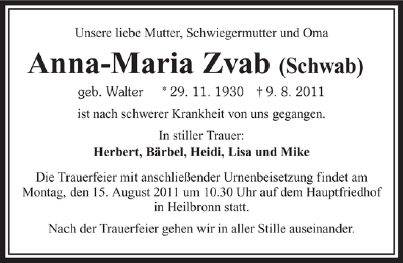 Hier finden Sie alle Traueranzeigen aus der Zeitung, die bisher für Anna-Maria Zvab erschienen sind. Weitere Traueranzeigen, die in der Zeitung erscheinen, werden hier ebenfalls aufgelistet