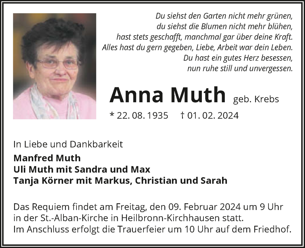 Hier finden Sie alle Traueranzeigen aus der Zeitung, die bisher für Anna Muth erschienen sind. Weitere Traueranzeigen, die in der Zeitung erscheinen, werden hier ebenfalls aufgelistet