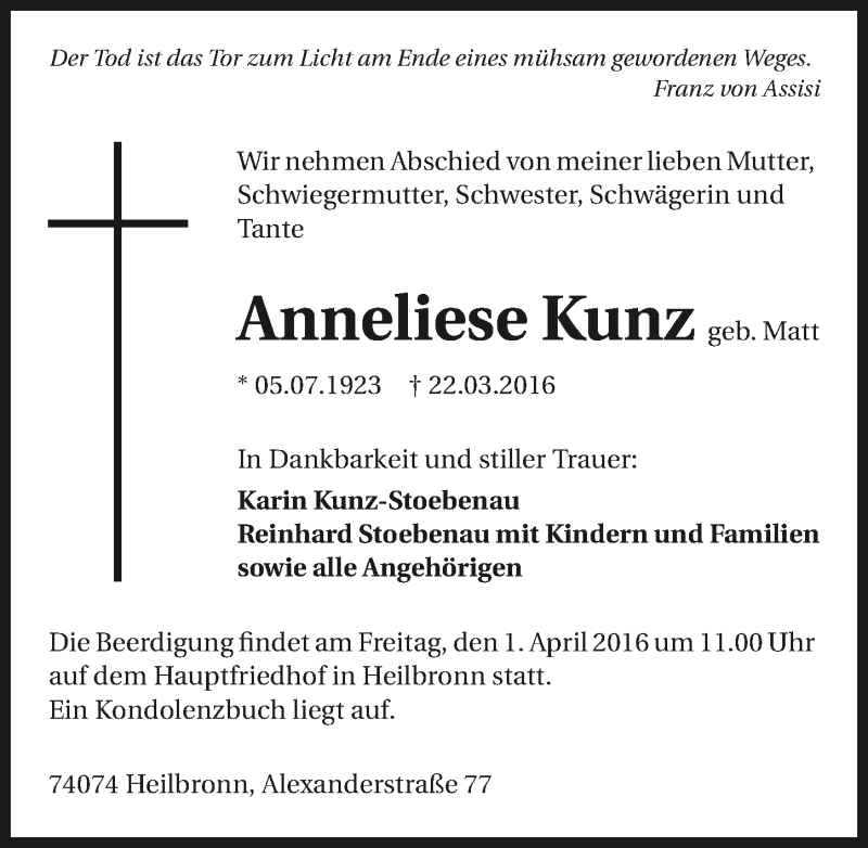 Hier finden Sie alle Traueranzeigen aus der Zeitung, die bisher für Anneliese Kunz erschienen sind. Weitere Traueranzeigen, die in der Zeitung erscheinen, werden hier ebenfalls aufgelistet