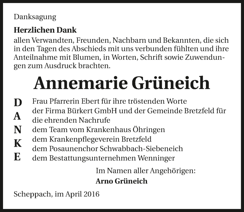 Hier finden Sie alle Traueranzeigen aus der Zeitung, die bisher für Annemarie Grüneich erschienen sind. Weitere Traueranzeigen, die in der Zeitung erscheinen, werden hier ebenfalls aufgelistet