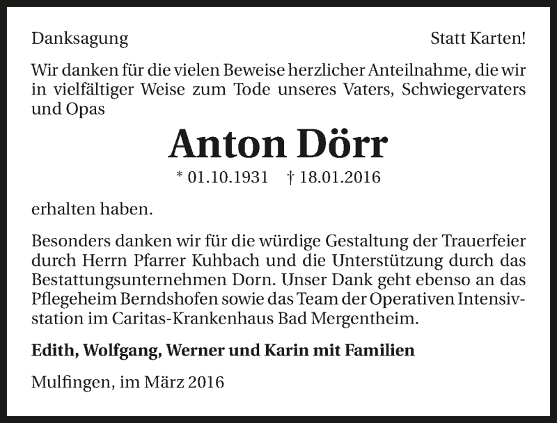 Hier finden Sie alle Traueranzeigen aus der Zeitung, die bisher für Anton Dörr erschienen sind. Weitere Traueranzeigen, die in der Zeitung erscheinen, werden hier ebenfalls aufgelistet