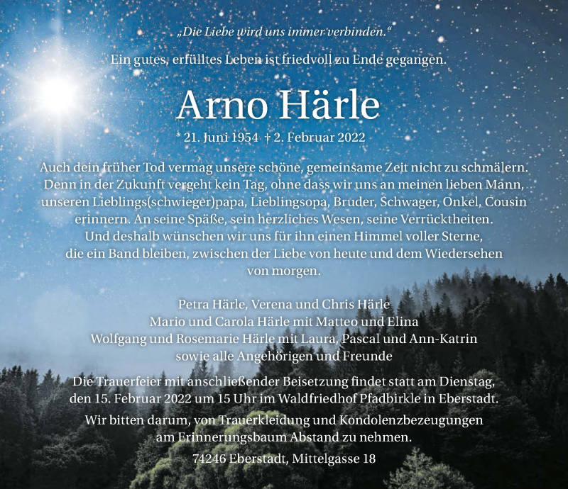 Hier finden Sie alle Traueranzeigen aus der Zeitung, die bisher für Arno Härle erschienen sind. Weitere Traueranzeigen, die in der Zeitung erscheinen, werden hier ebenfalls aufgelistet