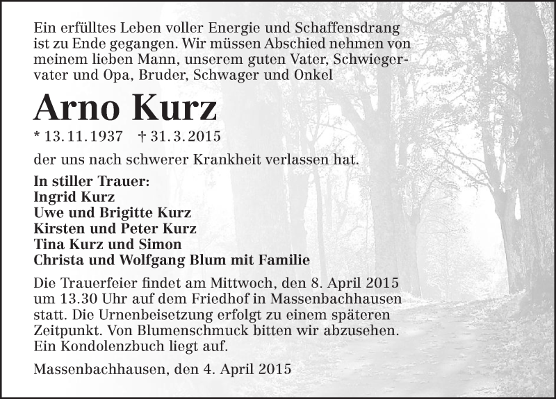 Hier finden Sie alle Traueranzeigen aus der Zeitung, die bisher für Arno Kurz erschienen sind. Weitere Traueranzeigen, die in der Zeitung erscheinen, werden hier ebenfalls aufgelistet