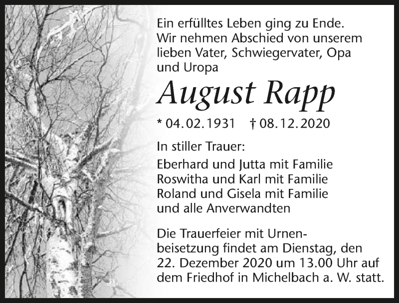 Hier finden Sie alle Traueranzeigen aus der Zeitung, die bisher für August Rapp erschienen sind. Weitere Traueranzeigen, die in der Zeitung erscheinen, werden hier ebenfalls aufgelistet