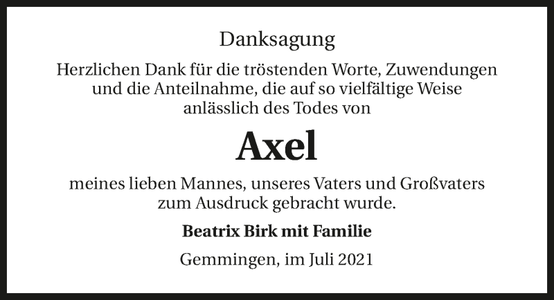 Hier finden Sie alle Traueranzeigen aus der Zeitung, die bisher für Axel Birk erschienen sind. Weitere Traueranzeigen, die in der Zeitung erscheinen, werden hier ebenfalls aufgelistet