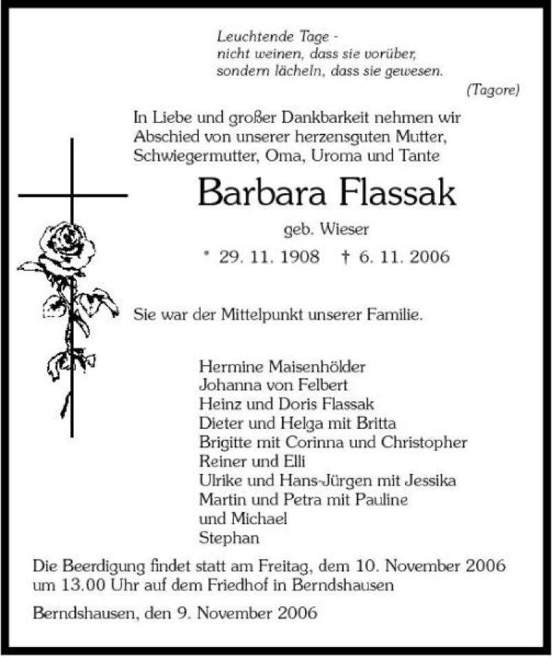 Hier finden Sie alle Traueranzeigen aus der Zeitung, die bisher für Barbara Flassak erschienen sind. Weitere Traueranzeigen, die in der Zeitung erscheinen, werden hier ebenfalls aufgelistet