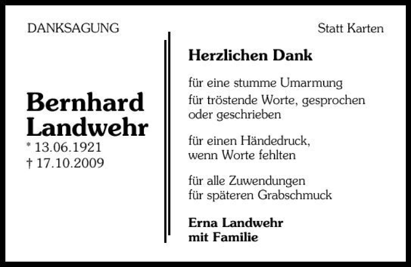 Hier finden Sie alle Traueranzeigen aus der Zeitung, die bisher für Bernhard Landwehr erschienen sind. Weitere Traueranzeigen, die in der Zeitung erscheinen, werden hier ebenfalls aufgelistet
