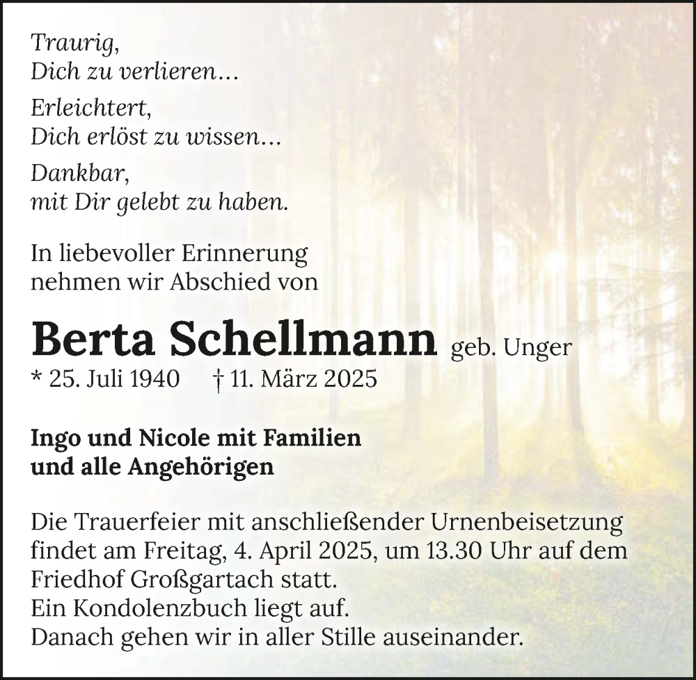 Hier finden Sie alle Traueranzeigen aus der Zeitung, die bisher für Berta Schellmann erschienen sind. Weitere Traueranzeigen, die in der Zeitung erscheinen, werden hier ebenfalls aufgelistet