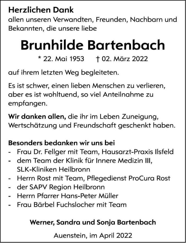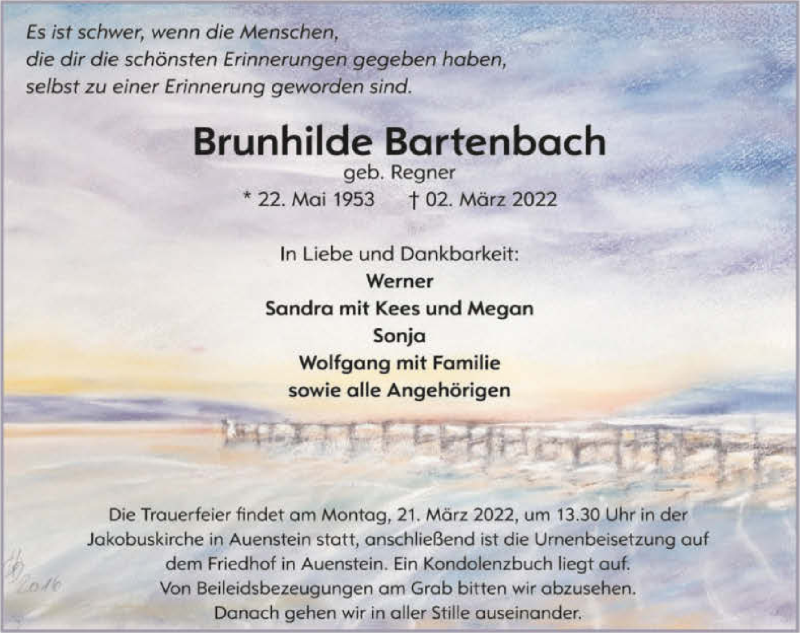 Hier finden Sie alle Traueranzeigen aus der Zeitung, die bisher für Brunhilde Bartenbach erschienen sind. Weitere Traueranzeigen, die in der Zeitung erscheinen, werden hier ebenfalls aufgelistet