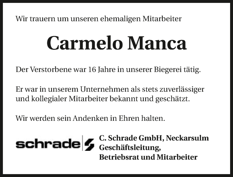 Hier finden Sie alle Traueranzeigen aus der Zeitung, die bisher für Carmelo Manca erschienen sind. Weitere Traueranzeigen, die in der Zeitung erscheinen, werden hier ebenfalls aufgelistet