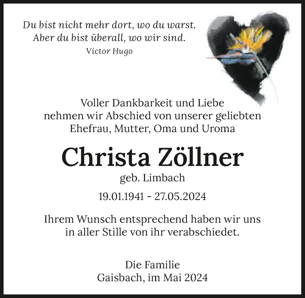 Hier finden Sie alle Traueranzeigen aus der Zeitung, die bisher für Christa Zöllner erschienen sind. Weitere Traueranzeigen, die in der Zeitung erscheinen, werden hier ebenfalls aufgelistet