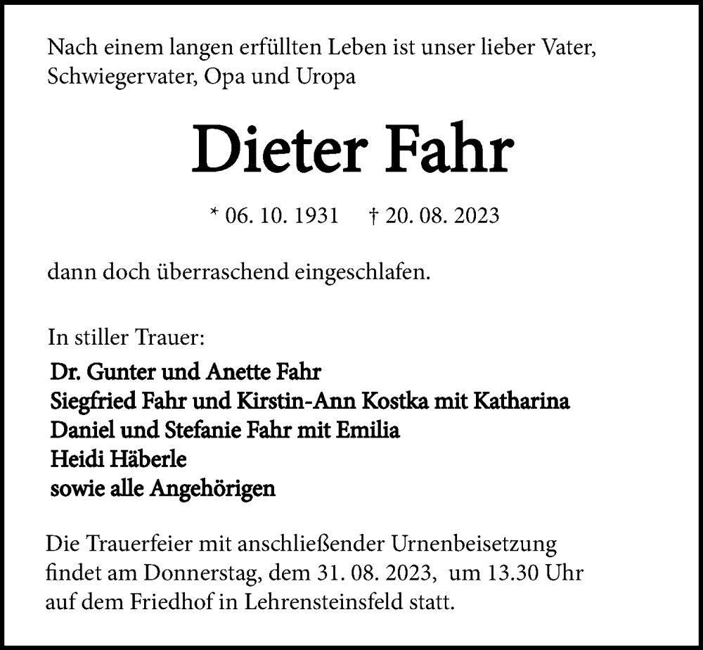 Hier finden Sie alle Traueranzeigen aus der Zeitung, die bisher für Dieter Fahr erschienen sind. Weitere Traueranzeigen, die in der Zeitung erscheinen, werden hier ebenfalls aufgelistet