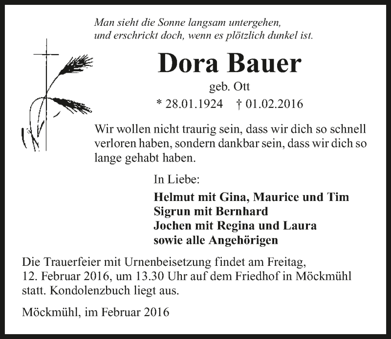 Hier finden Sie alle Traueranzeigen aus der Zeitung, die bisher für Dora Bauer erschienen sind. Weitere Traueranzeigen, die in der Zeitung erscheinen, werden hier ebenfalls aufgelistet