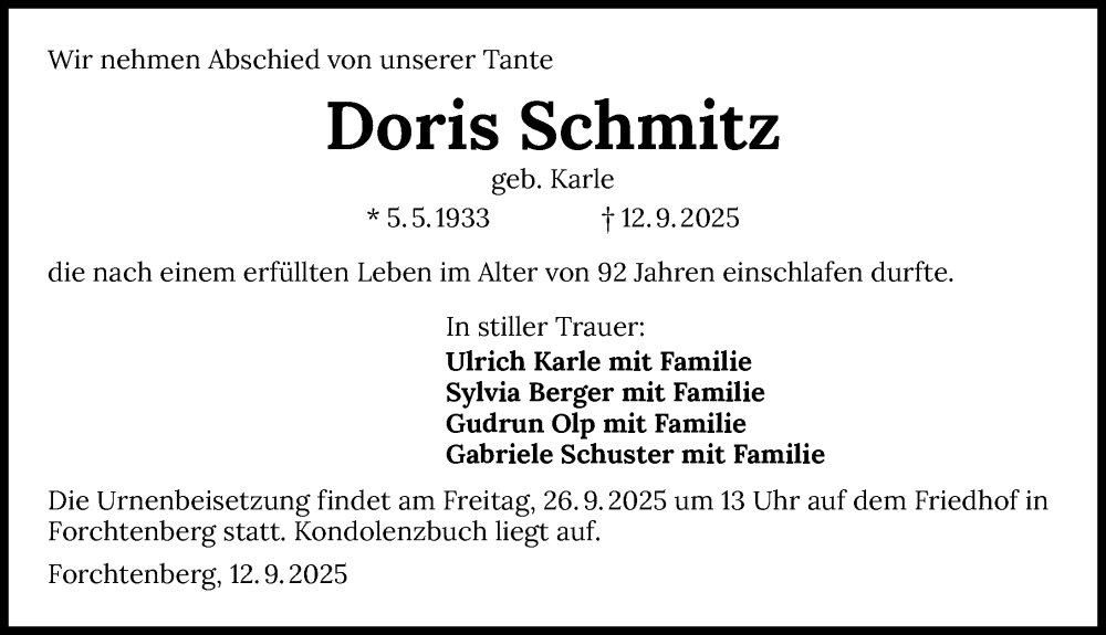 Hier finden Sie alle Traueranzeigen aus der Zeitung, die bisher für Doris Schmitz erschienen sind. Weitere Traueranzeigen, die in der Zeitung erscheinen, werden hier ebenfalls aufgelistet