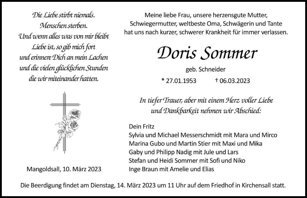 Hier finden Sie alle Traueranzeigen aus der Zeitung, die bisher für Doris Sommer erschienen sind. Weitere Traueranzeigen, die in der Zeitung erscheinen, werden hier ebenfalls aufgelistet