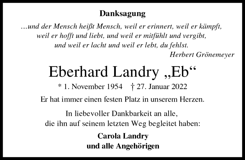 Hier finden Sie alle Traueranzeigen aus der Zeitung, die bisher für Eberhard Landry erschienen sind. Weitere Traueranzeigen, die in der Zeitung erscheinen, werden hier ebenfalls aufgelistet