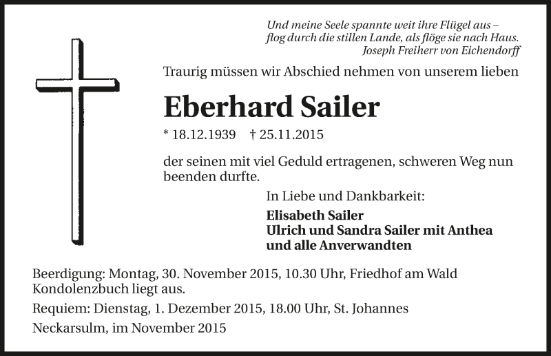 Hier finden Sie alle Traueranzeigen aus der Zeitung, die bisher für Eberhard Sailer erschienen sind. Weitere Traueranzeigen, die in der Zeitung erscheinen, werden hier ebenfalls aufgelistet
