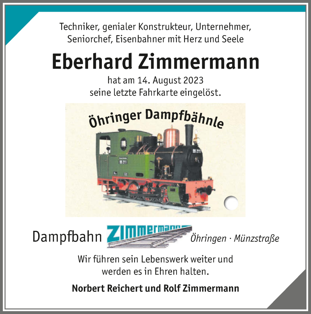 Hier finden Sie alle Traueranzeigen aus der Zeitung, die bisher für Eberhard Zimmermann erschienen sind. Weitere Traueranzeigen, die in der Zeitung erscheinen, werden hier ebenfalls aufgelistet