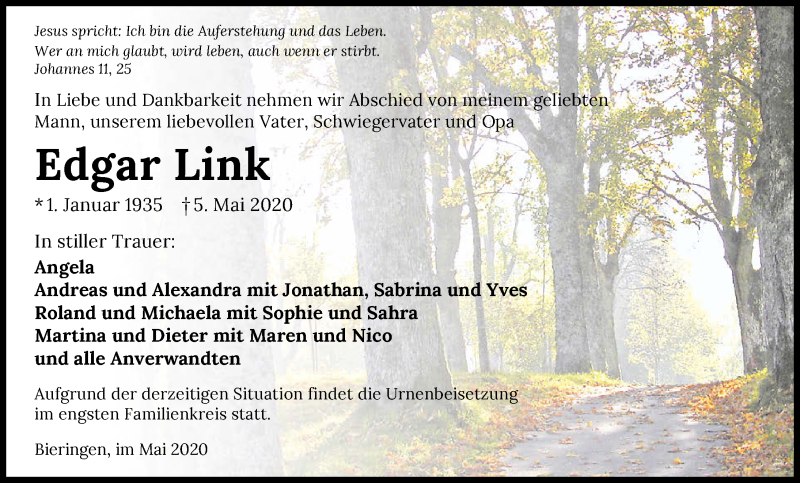 Hier finden Sie alle Traueranzeigen aus der Zeitung, die bisher für Edgar Link erschienen sind. Weitere Traueranzeigen, die in der Zeitung erscheinen, werden hier ebenfalls aufgelistet