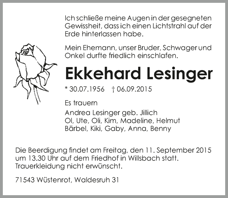Hier finden Sie alle Traueranzeigen aus der Zeitung, die bisher für Ekkehard Lesinger erschienen sind. Weitere Traueranzeigen, die in der Zeitung erscheinen, werden hier ebenfalls aufgelistet