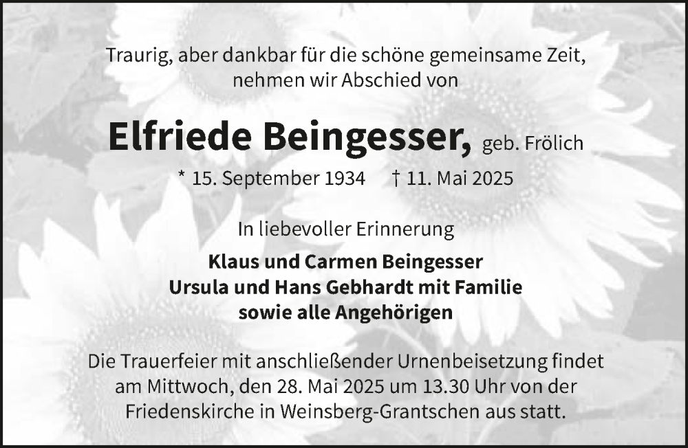 Hier finden Sie alle Traueranzeigen aus der Zeitung, die bisher für Elfriede Beingesser erschienen sind. Weitere Traueranzeigen, die in der Zeitung erscheinen, werden hier ebenfalls aufgelistet