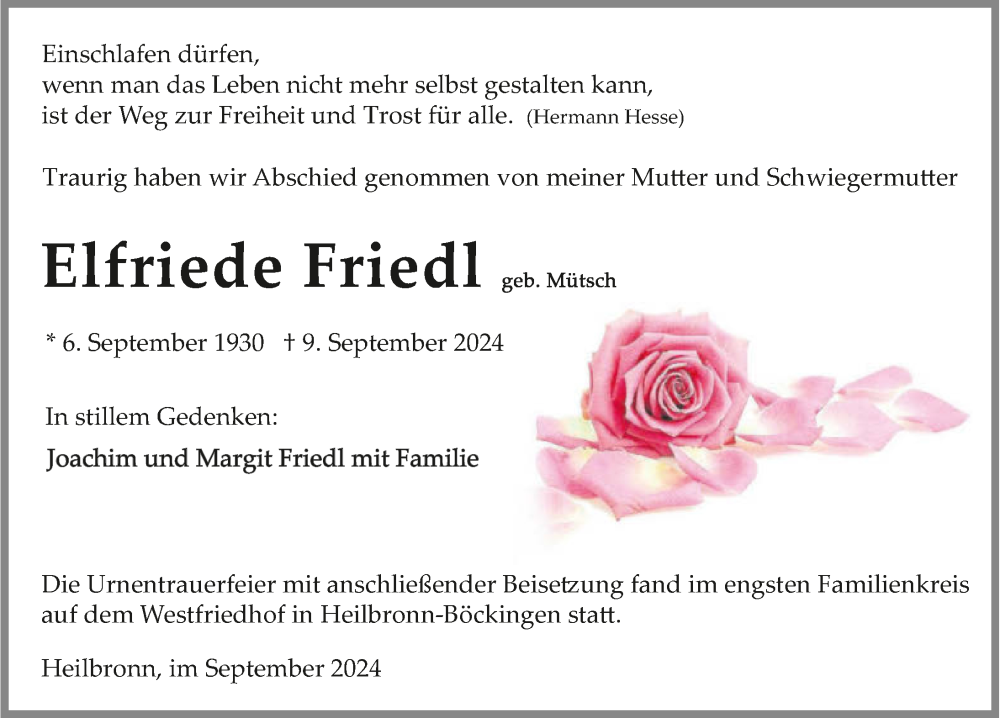 Hier finden Sie alle Traueranzeigen aus der Zeitung, die bisher für Elfriede Friedl erschienen sind. Weitere Traueranzeigen, die in der Zeitung erscheinen, werden hier ebenfalls aufgelistet