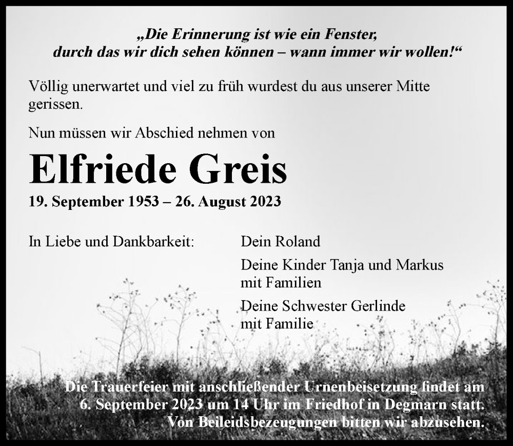 Hier finden Sie alle Traueranzeigen aus der Zeitung, die bisher für Elfriede Greis erschienen sind. Weitere Traueranzeigen, die in der Zeitung erscheinen, werden hier ebenfalls aufgelistet