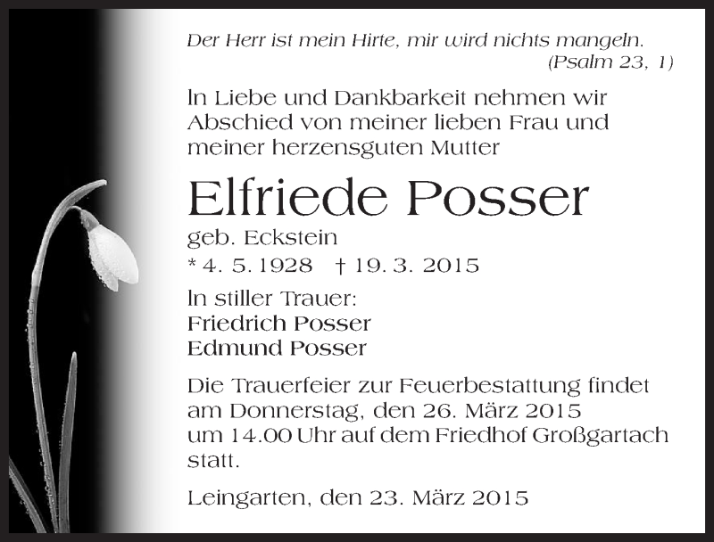 Hier finden Sie alle Traueranzeigen aus der Zeitung, die bisher für Elfriede Posser erschienen sind. Weitere Traueranzeigen, die in der Zeitung erscheinen, werden hier ebenfalls aufgelistet