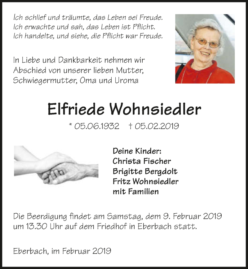 Hier finden Sie alle Traueranzeigen aus der Zeitung, die bisher für Elfriede Wohnsiedler erschienen sind. Weitere Traueranzeigen, die in der Zeitung erscheinen, werden hier ebenfalls aufgelistet